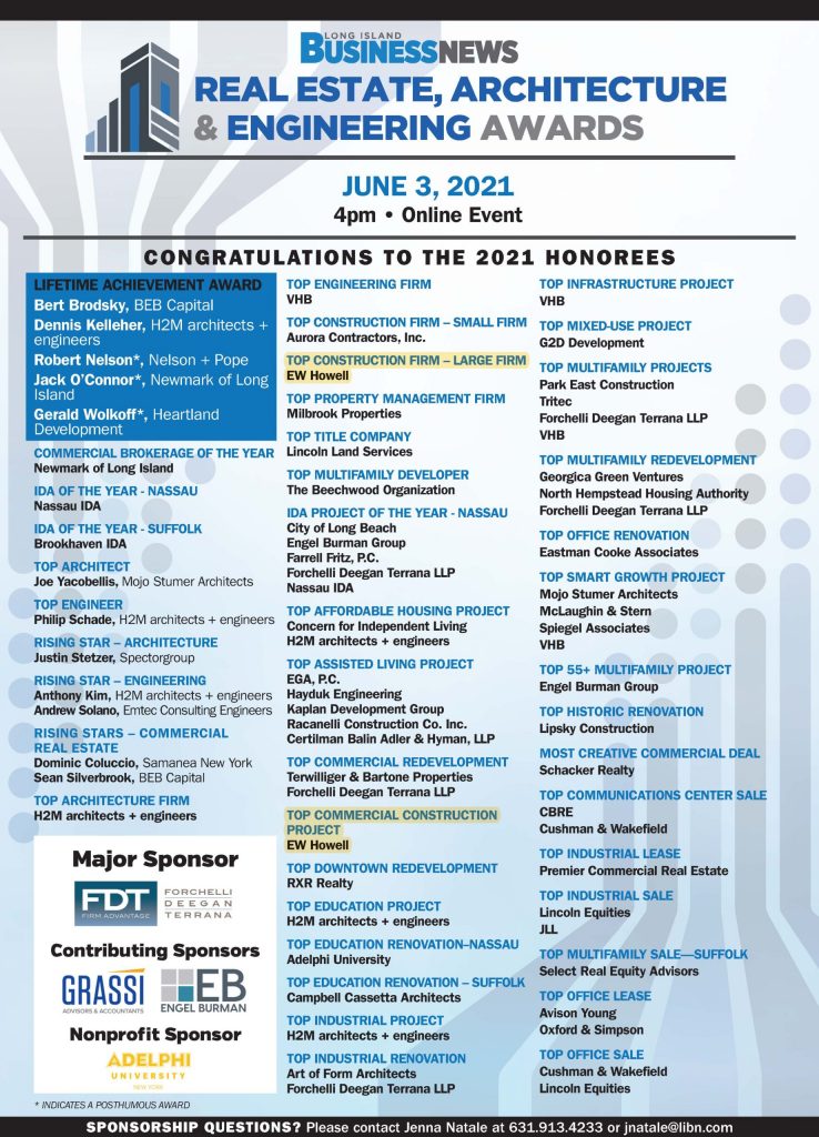 EW HOWELL IS RECOGNIZED IN MULTIPLE CATEGORIES FOR THE 2021 LONG ISLAND BUSINESS NEWS REAL ESTATE, ARCHITECTURE & ENGINEERING AWARDS